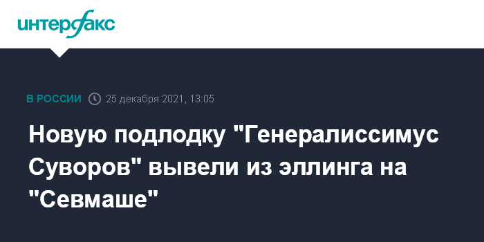 Москва. 25 декабря. INTERFAX.RU - Стратегическая атомная подводная лодка "Генералиссимус Суворов" в субботу выведена из эллинга на предприятии "Севмаш" в Северодвинске для спуска на воду, сообщила "Российская газета".