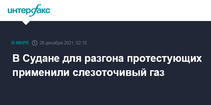 Москва. 26 декабря. INTERFAX.RU - Силы безопасности Судана в субботу применили слезоточивый газ для разгона протестующих в столице страны Хартуме. Об этом сообщает Associated Press.