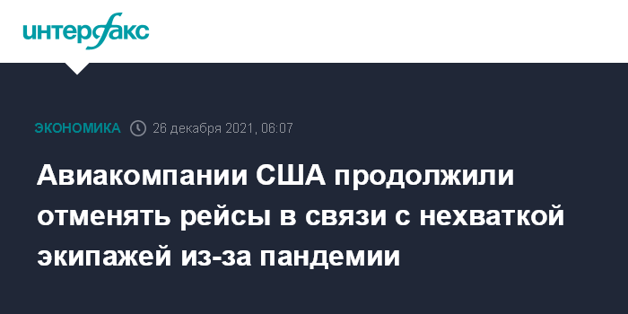 Москва. 26 декабря. INTERFAX.RU - В минувшую субботу несколько крупнейших авиакомпаний США отменили почти 1 тыс. авиарейсов, объяснив это кадровыми проблемами, связанными с распространением COVID-19, сообщило агентство Associated Press (АР) со ссылкой на данные сайта FlightAware, который отслеживает полеты самолетов.