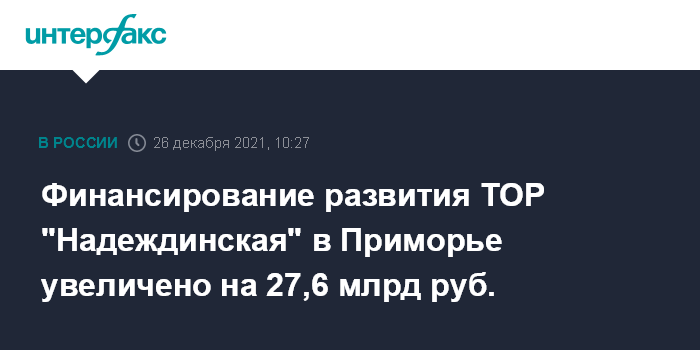 "С 6 млрд до 33,6 млрд рублей увеличен объем федерального финансирования на создание инфраструктуры ТОР "Надеждинская" в Приморском крае. Средства уже предусмотрены в федеральном бюджете в рамках финансирования мероприятий государственной программы "Социально-экономическое развитие Дальневосточного федерального округа", - говорится в сообщении.