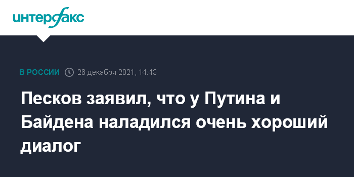 Москва. 26 декабря. INTERFAX.RU - Президенты России Владимир Путин и США Джо Байден наладили хороший диалог, они абсолютно конструктивно и уважительно излагают друг другу расхождения в своих позициях, сообщил пресс-секретарь президента РФ Дмитрий Песков.