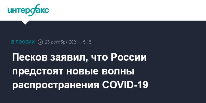 Москва. 26 декабря. INTERFAX.RU - Пресс-секретарь президента РФ Дмитрий Песков не ждет ничего хорошего от наступающего 2022 года в плане распространения пандемии коронавируса.