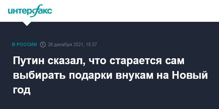 Москва. 26 декабря. INTERFAX.RU - Президент России Владимир Путин рассказал, что сам выбирает подарки своим внукам и планирует по традиции встретить Новый год вместе с близкими.