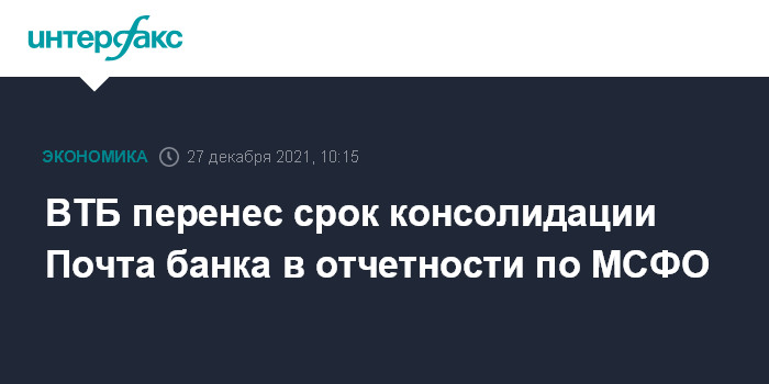 Москва. 27 декабря. INTERFAX.RU - ВТБ сдвинул срок консолидации результатов Почта банка в отчетности по МСФО за первый квартал 2022 года, сообщил журналистам финансовый директор ВТБ Дмитрий Пьянов.