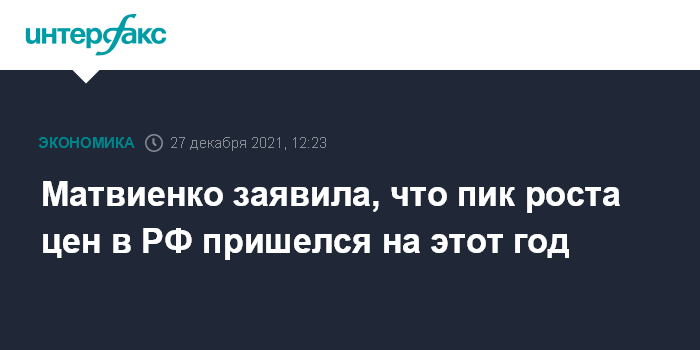 Москва. 27 декабря. INTERFAX.RU - Инфляция в России в этом году выросла в два раза относительно планируемого показателя, пик роста цен пришелся на уходящий год, но в 2022-м ситуация будет лучше, заявила глава Совета Федерации Валентина Матвиенко.