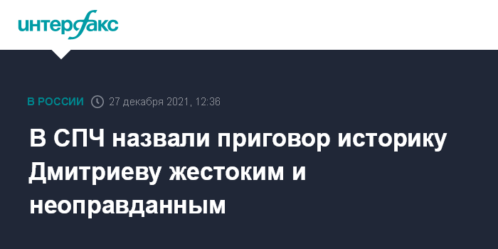 Москва. 27 декабря. INTERFAX.RU - Члены Совета при президенте РФ по развитию гражданского общества и правам человека (СПЧ) Александр Брод и Николай Сванидзе считают итоговый приговор историку Юрию Дмитриеву – 15 лет колонии строгого режима – жестоким и беспричинным.
