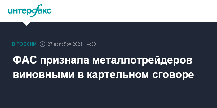 Москва. 27 декабря. INTERFAX.RU - Федеральная антимонопольная служба (ФАС) РФ признала металлотрейдеров виновными в заключении картельного соглашения, сообщила пресс-служба ведомства.