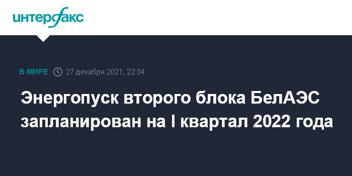 Москва. 27 декабря. INTERFAX.RU - Энергопуск второго блока БелАЭС запланирован на первый квартал 2022 года, сообщил заместитель главного инженера по подготовке персонала Белорусской АЭС Владимир Горин в эфире телеканала СТВ в понедельник.