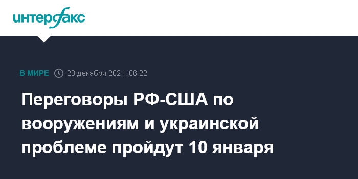 Москва. 28 декабря. INTERFAX.RU - Переговоры американских и российских представителей по контролю над вооружениями и украинской проблеме состоятся 10 января, сообщил журналистам на условиях анонимности представитель Совета национальной безопасности (СНБ) Белого дома США.