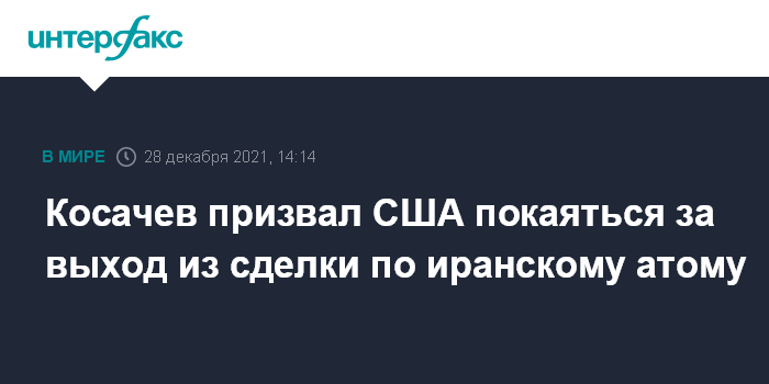 "Оценки действиям Трампа со стороны нынешней администрации не давалось. Нигде американцами не было сказано, что Америка времен Трампа в вопросе Совместного всеобъемлющего плана действий (СВПД) по иранской ядерной программе нарушила свои обязательства, международное право и что такие действия заслуживают осуждения. Если бы в Вашингтоне сказали, что больше этого никогда в жизни не произойдет, это было бы, на мой взгляд, честной позицией со стороны США", - сказал Косачев в интервью "Интерфаксу".