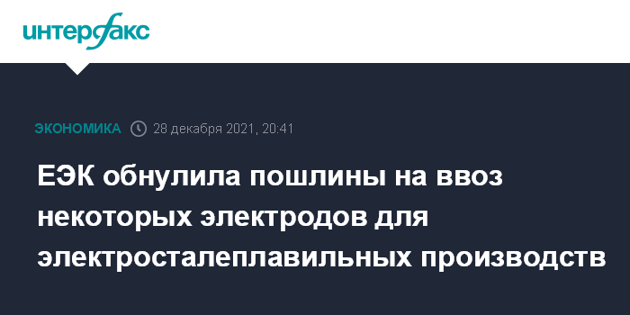 Москва. 28 декабря. INTERFAX.RU - Коллегия Евразийской экономической комиссии (ЕЭК) обнулила ставку ввозной таможенной пошлины в отношении отдельных видов графитированных электродов (коды 8545 11 008 9 ТН ВЭД ЕАЭС) сроком на два года.