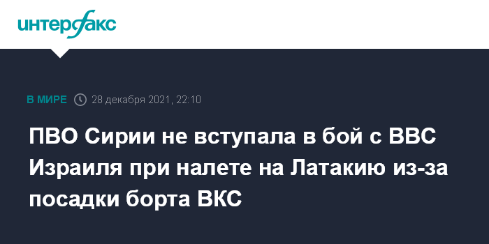 Москва. 28 декабря. INTERFAX.RU - Силы ПВО Сирии не вступали в бой по отражению налета ВВС Израиля на порт Латакии, так как в зоне поражения мог оказаться транспортный самолет ВКС РФ, заходивший на посадку, сообщил заместитель руководителя российского Центра по примирению враждующих сторон в САР контр-адмирал Олег Журавлев.