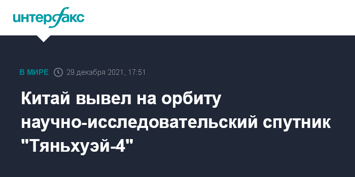 Москва. 29 декабря. INTERFAX.RU - Китай успешно вывел на намеченную орбиту спутник дистанционного зондирования "Тяньхуэй-4" (Tianhui-4), сообщила в среду Шанхайская академия космических технологий (SAST).