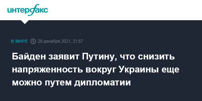 Москва. 29 декабря. INTERFAX.RU - Президент США Джо Байден в ходе предстоящего в четверг телефонного разговора с президентом РФ Владимиром Путиным скажет, что добиться деэскалации ситуации вокруг Украины все еще возможно дипломатическими методами, сообщил в среду телеканал CNN со ссылкой на неназванного представителя Белого дома.