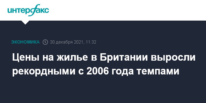 Москва. 30 декабря. INTERFAX.RU - Цены на жилье в Великобритании в декабре подскочили на 10,4% в годовом выражении после роста на 10% в ноябре, свидетельствуют данные британского ипотечного общества Nationwide Building Society.