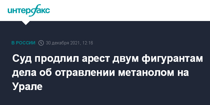 Москва. 30 декабря. INTERFAX.RU - Свердловский областной суд счел законным продление ареста еще двум обвиняемым по делу о сбыте метилового спирта и смертельном отравлении людей в регионе.