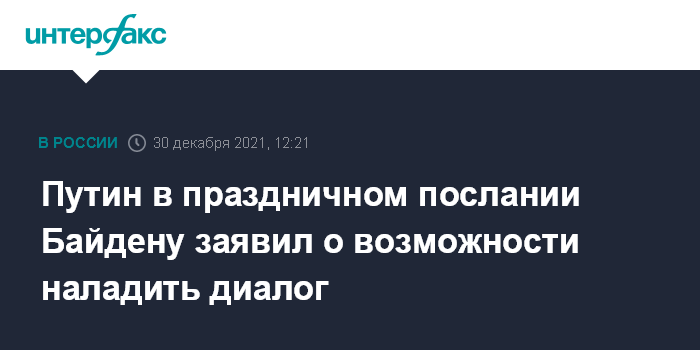 Москва. 30 декабря. INTERFAX.RU - Президент РФ Владимир Путин в новогоднем поздравлении президенту США Джо Байдену выразил убеждение в возможности наладить эффективный российско-американский диалог.