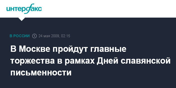 Москва. 24 мая. ИНТЕРФАКС - Основные торжества в рамках ежегодных Дней славянской письменности и культуры, празднование которых началось 21 мая, пройдут в воскресенье, день памяти святых равноапостольных Кирилла и Мефодия.