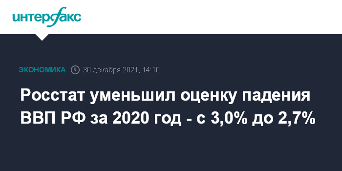 Москва. 30 декабря. INTERFAX.RU - Росстат уменьшил оценку падения ВВП РФ в 2020 году - до 2,7% с 3,0%, повысил оценку роста в 2019 году - до 2,2% с 2,0%, следует из сообщения статслужбы.