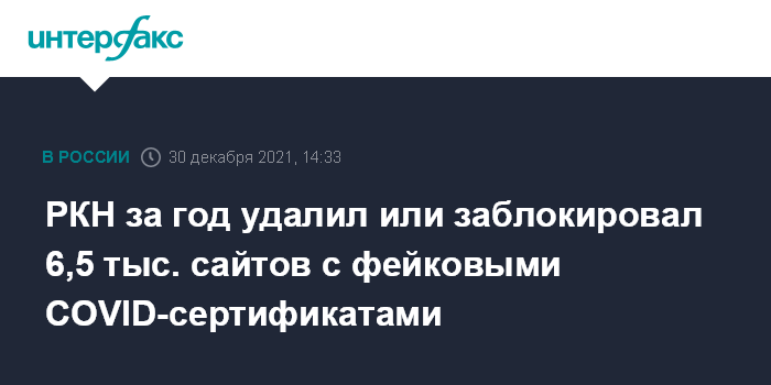 Москва. 30 декабря. INTERFAX.RU - Роскомнадзор в 2021 году добился блокировки или удаления 6,5 тыс. сайтов с информацией о продаже поддельных COVID-сертификатов, а также генерирующих фейковые QR-коды, сообщили "Интерфаксу" в ведомстве.