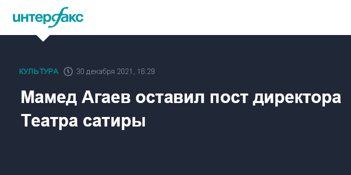 Москва. 30 декабря. INTERFAX.RU - Мамед Агаев ушел с поста директора Московского академического Театра сатиры по собственному желанию, новый директор театра пока не назначен, сообщила "Интерфаксу" руководитель литературно-драматургической части в театре Нина Карпова.