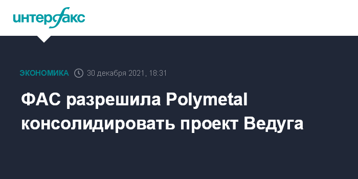 Москва. 30 декабря. INTERFAX.RU - ФАС России разрешила Polymetal консолидировать золоторудный проект Ведуга в Красноярском крае.