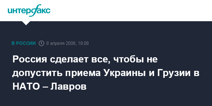 Москва. 8 апреля. INTERFAX.RU - Россия не допустит, чтобы Грузия и Украина стали членами НАТО, заявил глава МИД РФ Сергей Лавров. "Мы будем делать все, чтобы не допустить принятия Украины и Грузии в НАТО и не допустить неизбежно связанного с возможным принятием резкого ухудшения наших отношений и с Альянсом, и с ведущими его членами, и с нашими соседями", - сказал он во вторник в интервью радиостанции "Эхо Москвы".