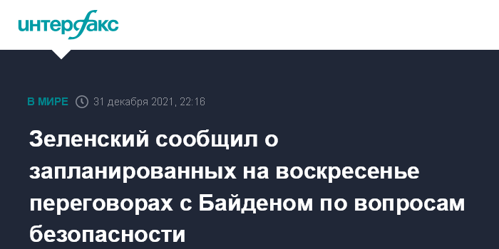 Москва. 31 декабря. INTERFAX.RU - Президент Украины Владимир Зеленский сообщил о запланированных на воскресенье, 2 января, переговорах с президентом США Джозефом Байденом, на которых будут обсуждаться вопросы безопасности.