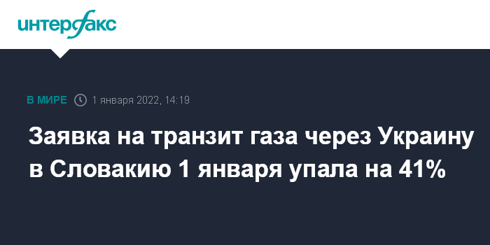 Москва. 1 января. INTERFAX.RU - Заявка на прокачку газа через Украину в направлении Словакии в первый день 2022 года упала на 40,9%, свидетельствуют данные словацкого газотранспортного оператора Eustream.