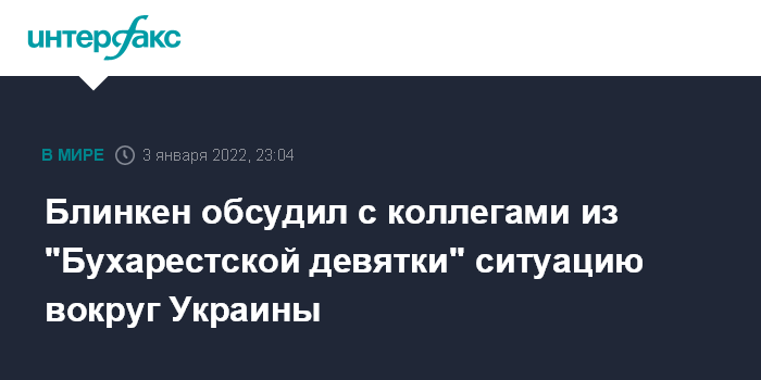 Москва. 3 января. INTERFAX.RU - Госсекретарь США Энтони Блинкен в понедельник в ходе телефонного разговора с коллегами из "Бухарестской девятки" обсудил тему присутствия войск России вблизи границы с Украиной, а также заявил о необходимости единой позиции НАТО в отношении украинского кризиса, сообщает Госдеп США.
