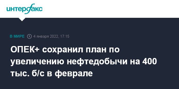 В июле прошлого года страны ОПЕК+ договорились наращивать нефтедобычу на 400 тыс. баррелей в сутки каждый месяц до истечения ограничений, взятых на себя с мая 2020 года в объеме 9,7 млн б/с, но каждый месяц встречаться, чтобы корректировать договоренности в случае необходимости. По состоянию на январь 2022 года ограничения составляют около 4 млн б/с.
