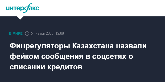 Москва. 5 января. INTERFAX.RU - Сообщения о списании кредитов, распространяемые через социальные сети и мессенджеры, не соответствуют действительности, говорится в совместном заявлении Агентства по регулированию и развитию финансового рынка и Национального банка Казахстана.