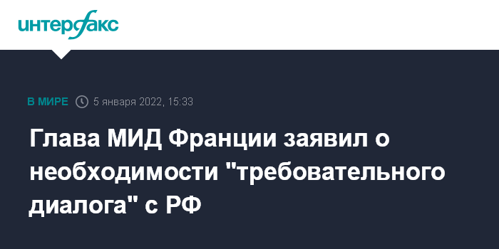 Москва. 5 января. INTERFAX.RU - Министр иностранных дел Франции Жан-Ив Ле Дриан заявил, что в ходе консультаций с европейскими партнерами он подчеркивал важность их тесной координации перед дискуссиями с Россией в разных форматах в ближайшую неделю, считает, что с РФ необходимо вести "требовательный диалог".