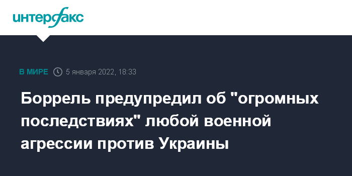 Москва. 5 января. INTERFAX.RU - Любая военная агрессия против Украины будет иметь огромные последствия и серьезную цену, заявил высокий представитель ЕС по вопросам внешней политики и политики безопасности Жозеп Боррель.