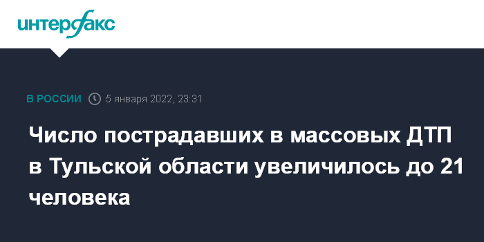 Москва. 5 января. INTERFAX.RU - Более 20 человек пострадали в результате нескольких ДТП на двух федеральных трассах в Тульской области, сообщили "Интерфаксу" в пресс-службе Минздрава региона.