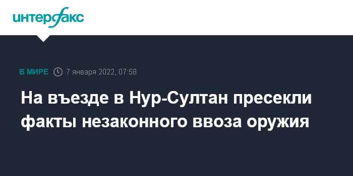 Москва. 7 января. INTERFAX.RU - На одном из въездов в столицу Казахстана Нур-Султан силовики пресекли незаконный ввоз оружия, задержано несколько микроавтобусов с выходцами из южного Казахстана, сообщили в эфире гостелеканала 24k.
