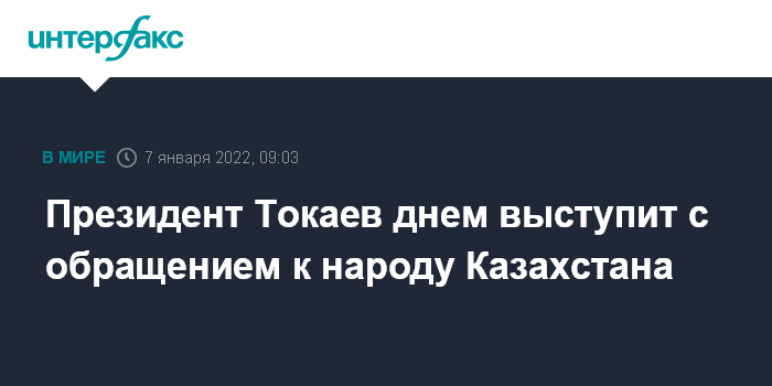 Москва. 7 января. INTERFAX.RU - Президент Казахстана Касым-Жомарт Токаев 7 января выступит с обращением к народу, сообщил гостелеканал "24.kz" со ссылкой на пресс-секретаря главы государства Берика Уали.