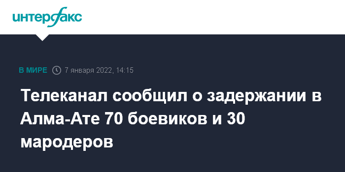 Москва. 7 января. INTERFAX.RU - В Алма-Ате силовики задержали больше 70 боевиков, которые нападали на здания, и больше трех десятков мародеров, сообщил государственный телеканал "Хабар 24" со ссылкой на городской департамент полиции.