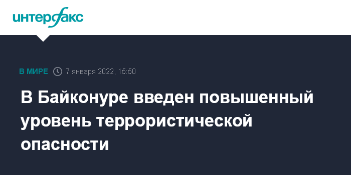 Москва. 7 января. INTERFAX.RU - Глава администрации Байконура Константин Бусыгин с полудня 7 января до полуночи 19 января ввел в городе повышенный, "синий" уровень террористической опасности в связи с протестами и беспорядками во всей стране.