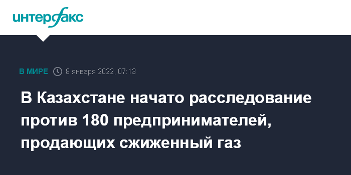 Москва. 8 января. INTERFAX.RU - Агентство по защите и развитию конкуренции Казахстана сообщило о начале расследования в отношении 180 предпринимателей, занимающихся розничной реализацией сжиженного нефтяного газа.