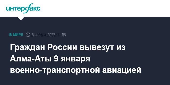"Вниманию граждан России, находящихся в алматинском регионе. С учетом приостановления регулярного пассажирского авиасообщения через Алматы между Республикой Казахстан и Российской Федерацией 9 января 2022 г. с 17:00 до 18:00 из международного аэропорта этого города по маршрутам Алматы - Иваново и Алматы - Оренбург будут выполнены рейсы военно-транспортной авиации Министерства обороны России для доставки россиян на Родину", - говорится в сообщении посольства.