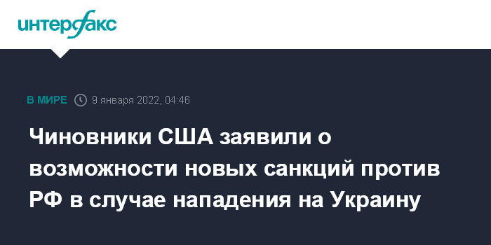 Москва. 9 января. INTERFAX.RU - Перед российско-американскими переговорами по гарантиям безопасности, запланированными на 10 января в Женеве, американские официальные лица продолжают выдвигать новые сферы возможных санкций против России в случае эскалации ситуации вокруг Украины, сообщает агентство Associated Press (AP).