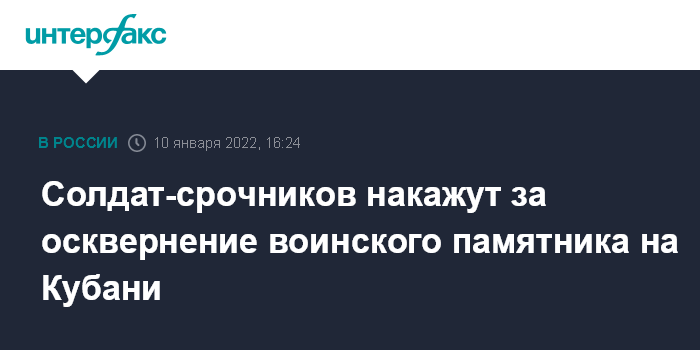 Москва. 10 января. INTERFAX.RU - Призывников, снявших на видео, как их сослуживец дает пощечину и пинает памятник воинам на Кубани, привлекут к административной и дисциплинарной ответственности. Об этом сообщили в понедельник "Интерфаксу" в пресс-службе Южного военного округа.