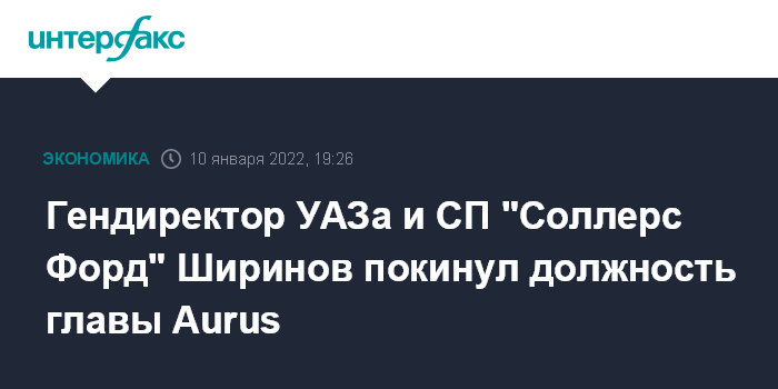 Москва. 10 января. INTERFAX.RU - Гендиректор ООО "УАЗ" (основной актив ПАО "Соллерс Авто" Вадима Швецова) и ООО "Соллерс Форд" (СП "Соллерс Авто" и Ford) Адиль Ширинов покинул должность главы производителя российского люксового автомобиля Aurus (ООО "Аурус"), сообщила компания.