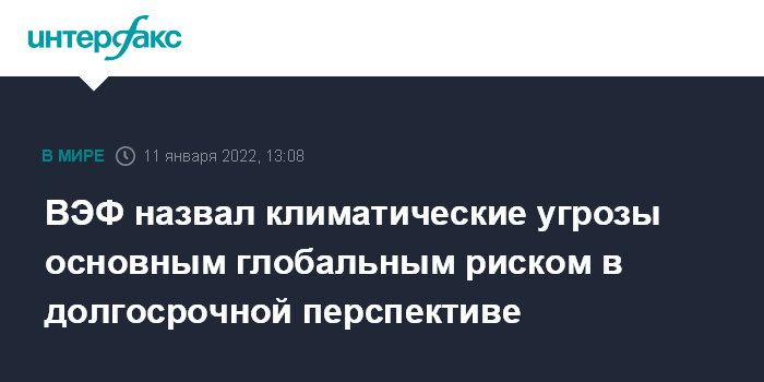 Москва. 11 января. INTERFAX.RU - Основные глобальные риски в долгосрочной перспективе связаны с изменениями климата, следует из доклада Global Risks Report 2022 Всемирного экономического форума (ВЭФ).