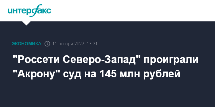 Москва. 11 января. INTERFAX.RU - ПАО "Россети Северо-Запад" (ранее - "МРСК Северо-Запада") проиграло ПАО "Акрон" суд на 145 млн рублей, сообщила "Интерфаксу" официальный представитель Новгородского областного суда Мария Воробьева.