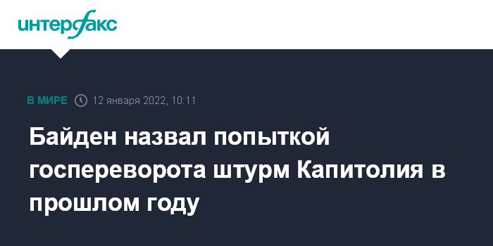 Москва. 12 января. INTERFAX.RU - Президент США Джо Байден заявил, что считает произошедшие в январе 2021 года беспорядки в Капитолии попыткой государственного переворота.