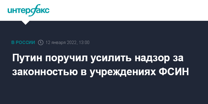 Москва. 12 января. INTERFAX.RU - Президент РФ Владимир Путин поручил органам прокуратуры совместно с общественными и правозащитными организациями усилить надзор за соблюдением законности в учреждениях Федеральной службы исполнения наказаний (ФСИН).
