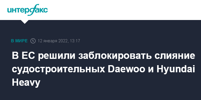 Москва. 12 января. INTERFAX.RU - Европейские антимонопольные регуляторы готовятся заблокировать сделку по слиянию двух крупнейших в мире судостроительных компаний из Южной Кореи - Daewoo Shipbuilding & Marine Engineering и Hyundai Heavy Industries - на сумму $2 млрд, пишет Financial Times со ссылкой на источники.