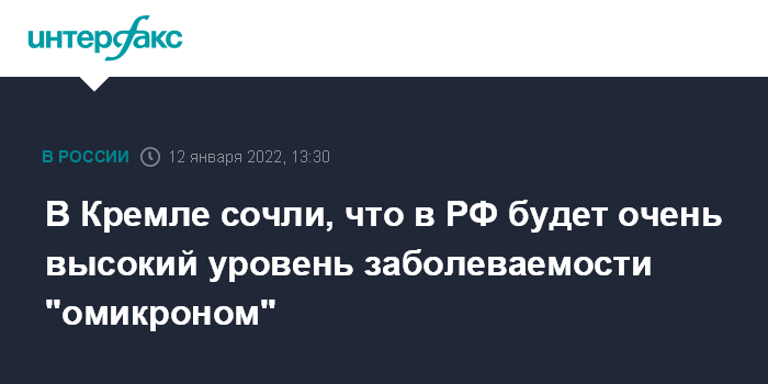 Москва. 12 января. INTERFAX.RU - Уровень заболеваемости в ходе предполагаемого всплеска распространения в России штамма коронавируса "омикрон" будет очень высоким, заявил пресс-секретарь президента РФ Дмитрий Песков.